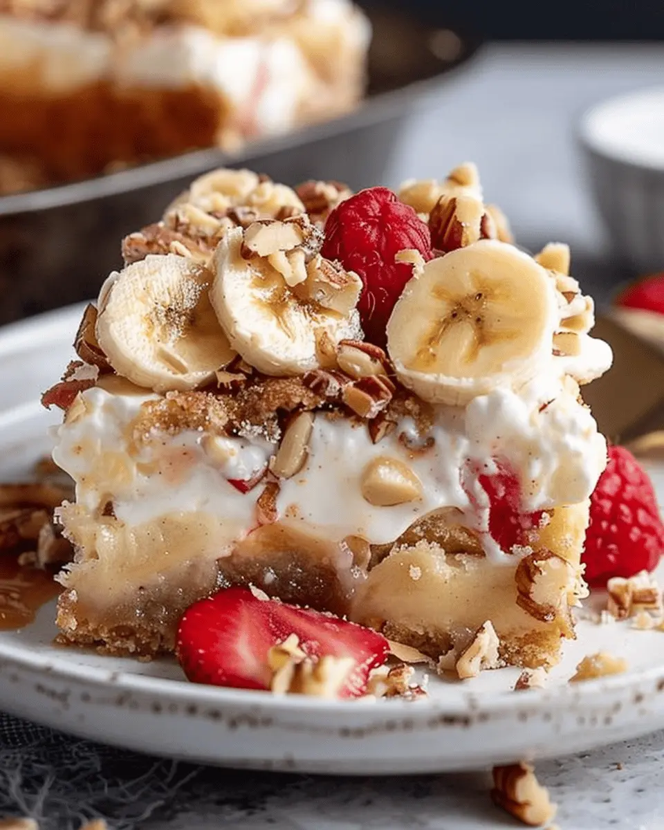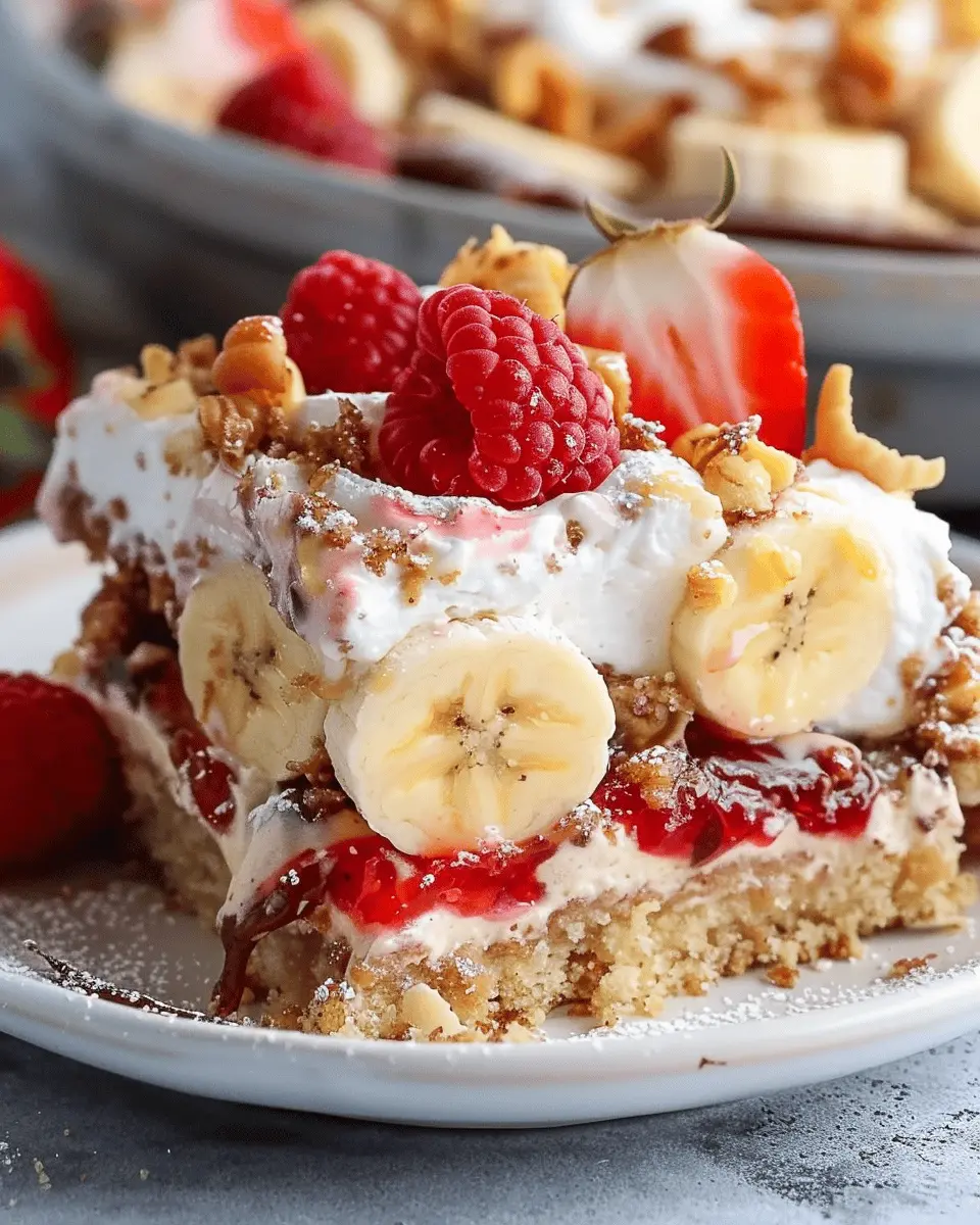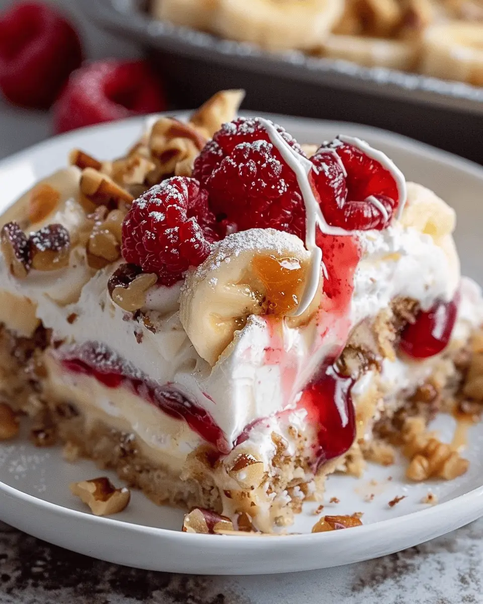 To elevate your banana split experience, consider pairing it with a scoop of vanilla ice cream. This not only enhances the flavor but also balances the warmth of the cake with a cool, creamy texture. For a drink, a tall glass of cold brew coffee or a refreshing sparkling water with lemon makes for a delightful accompaniment.