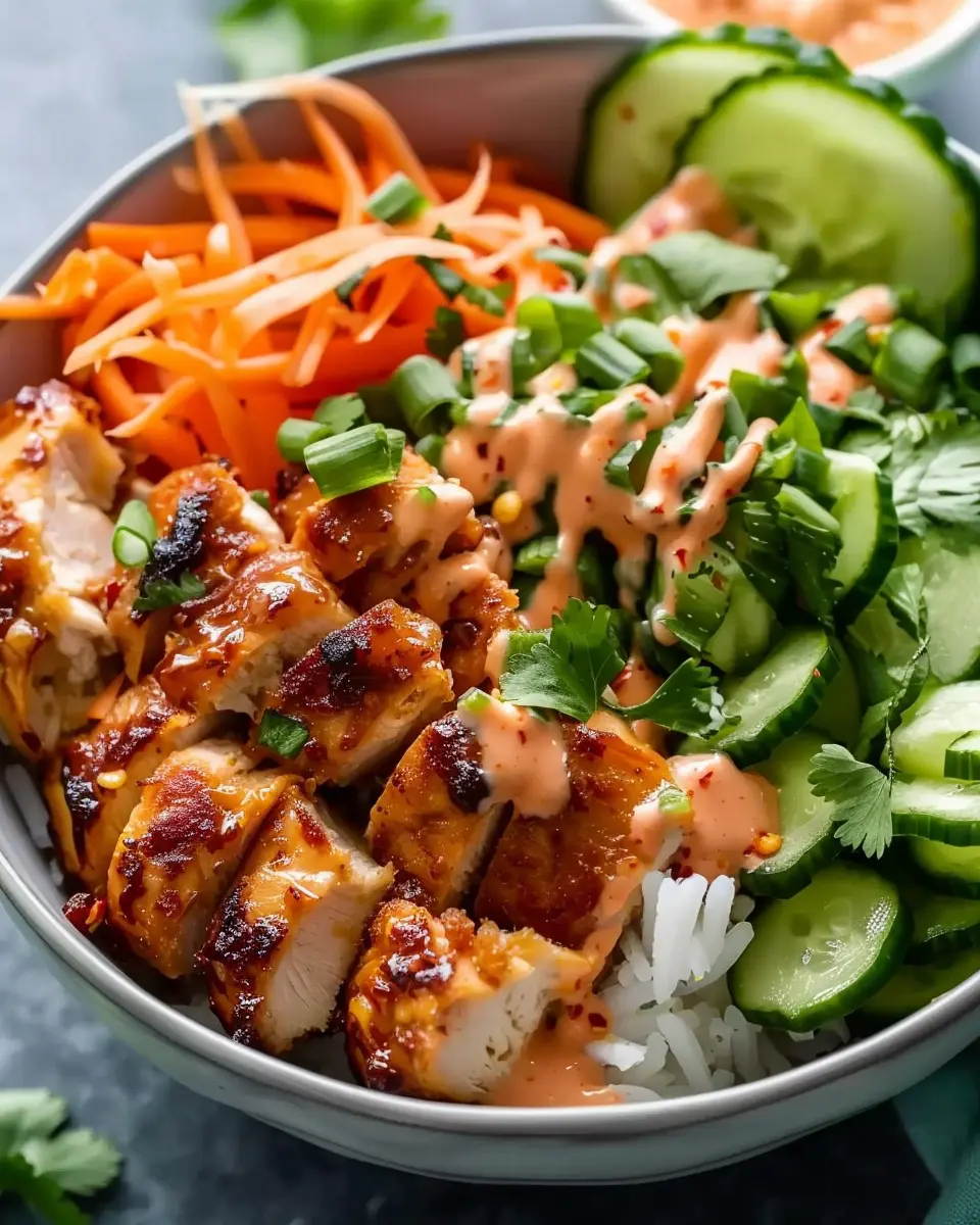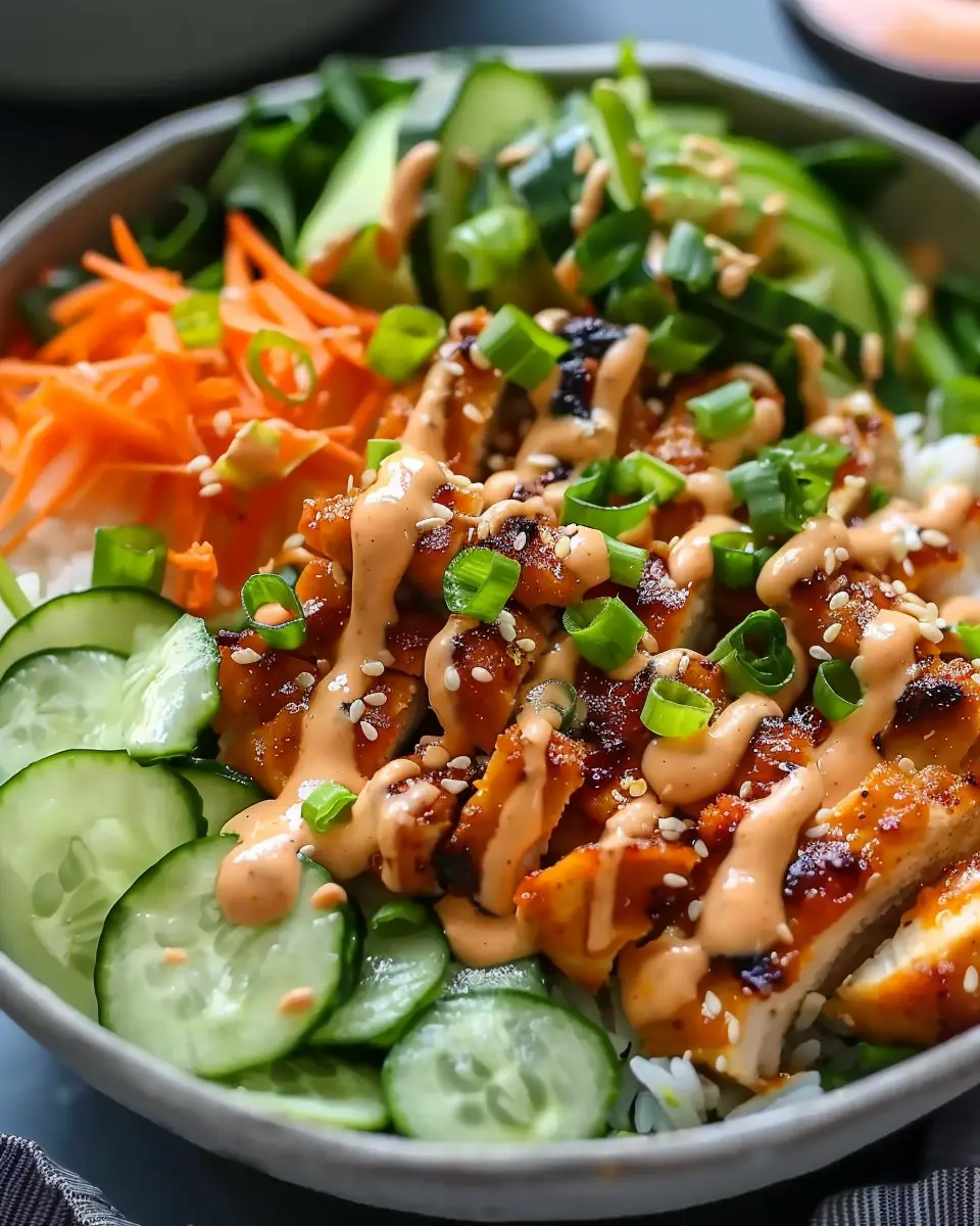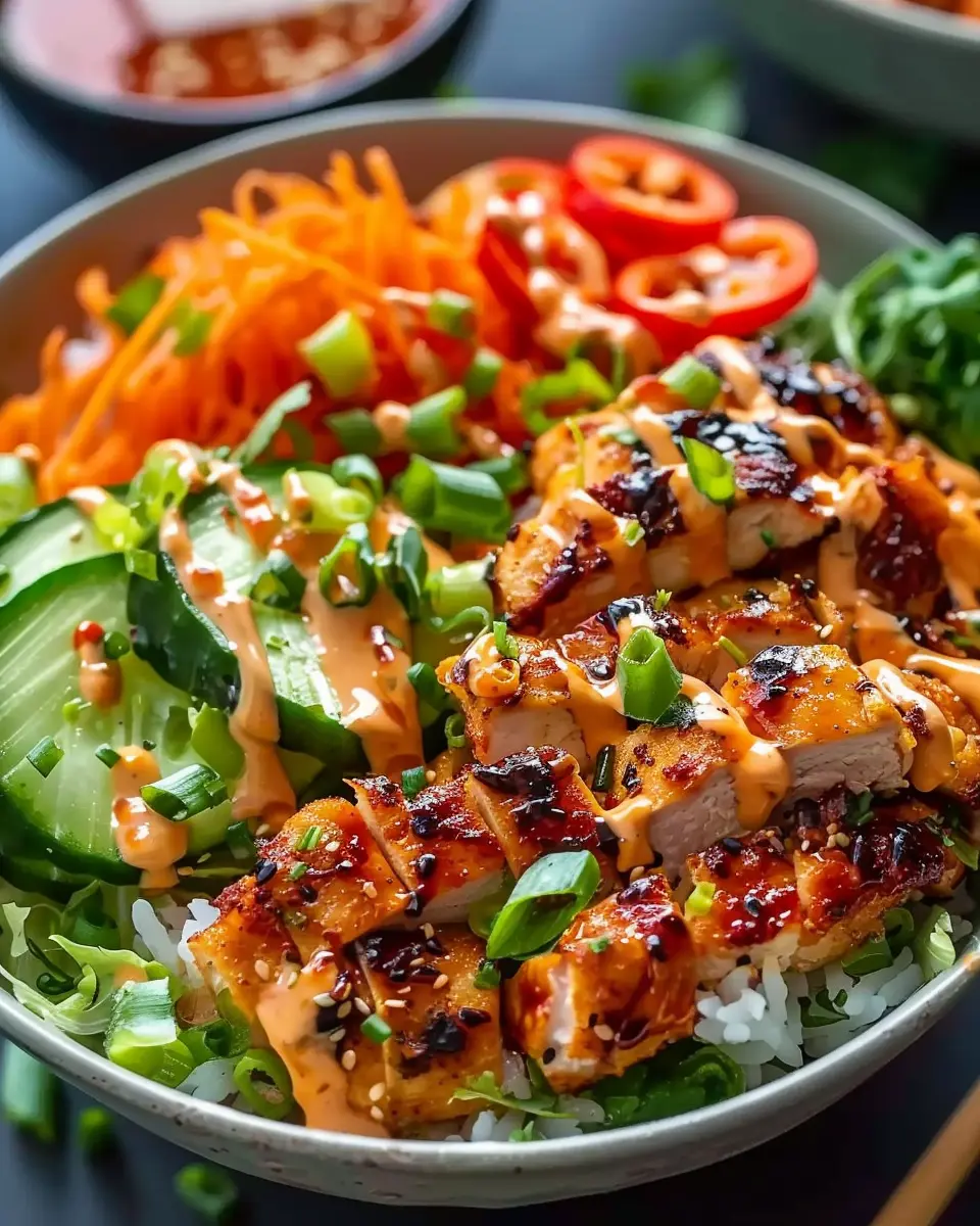 Feel free to add additional toppings like avocado or lettuce if you’re feeling adventurous! This bowl not only looks stunning but also balances the crispy chicken, fresh veggies, and creamy sauce effortlessly.