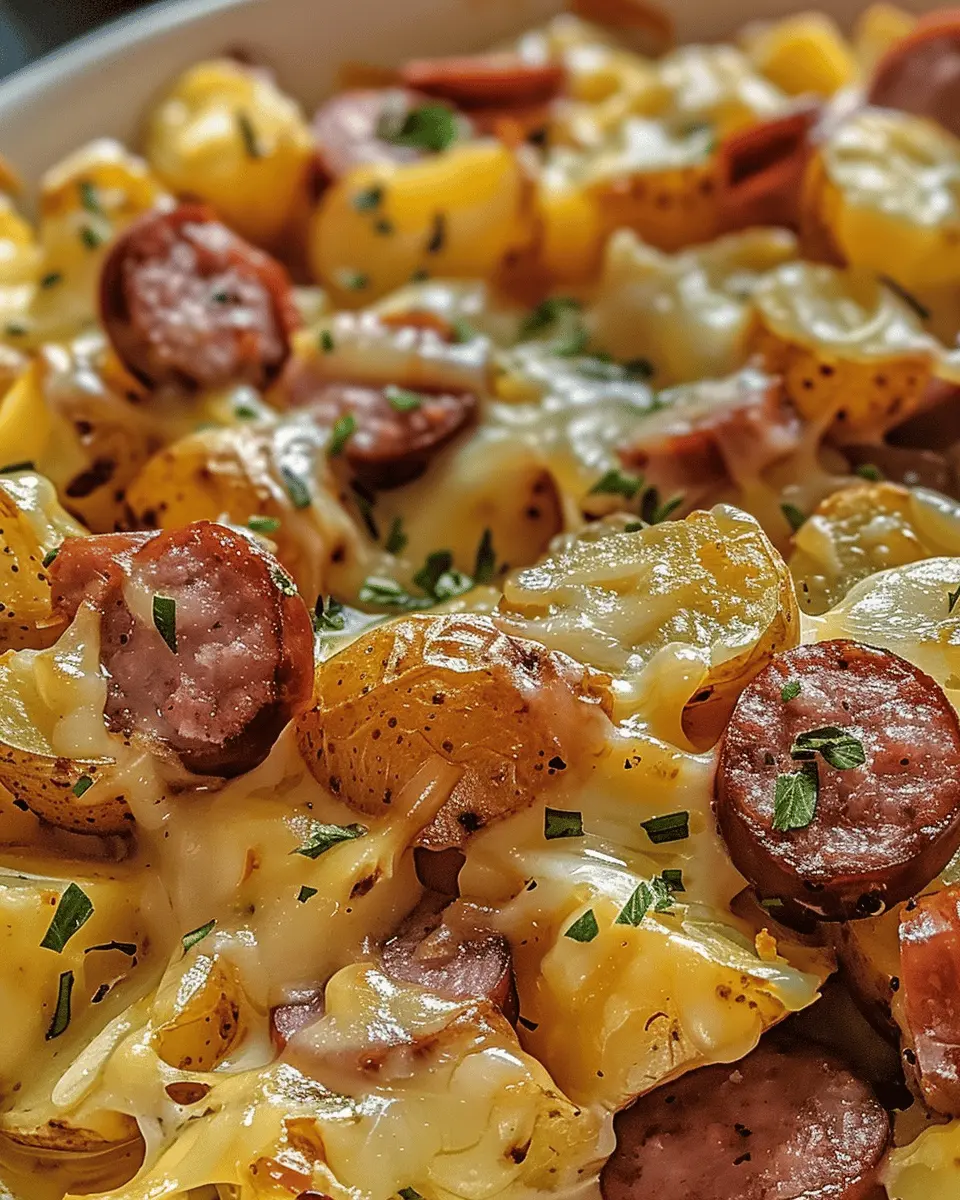 A delicious and easy recipe combining cheesy ranch potatoes and smoked sausage, perfect for family meals.