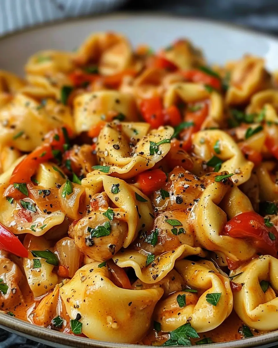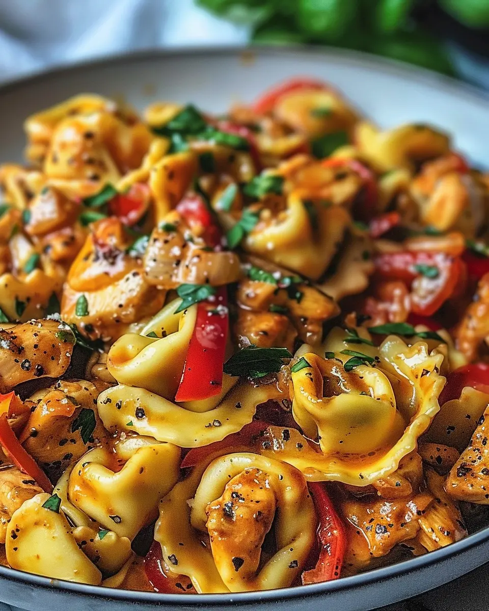 - Combine cooked tortellini with the chicken and pepper mixture.