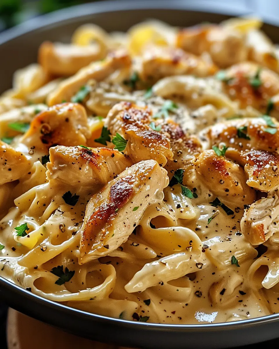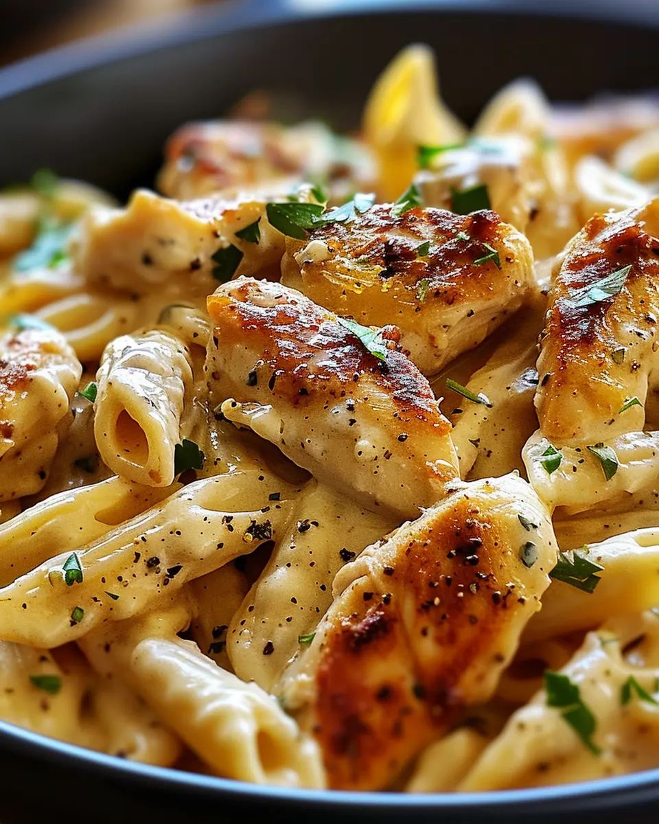Mix together: Add the drained pasta to the creamy sauce, followed by the sliced chicken. Toss everything together gently until the pasta is coated in that luscious sauce. If it appears too thick, a splash of pasta water can help loosen it up.