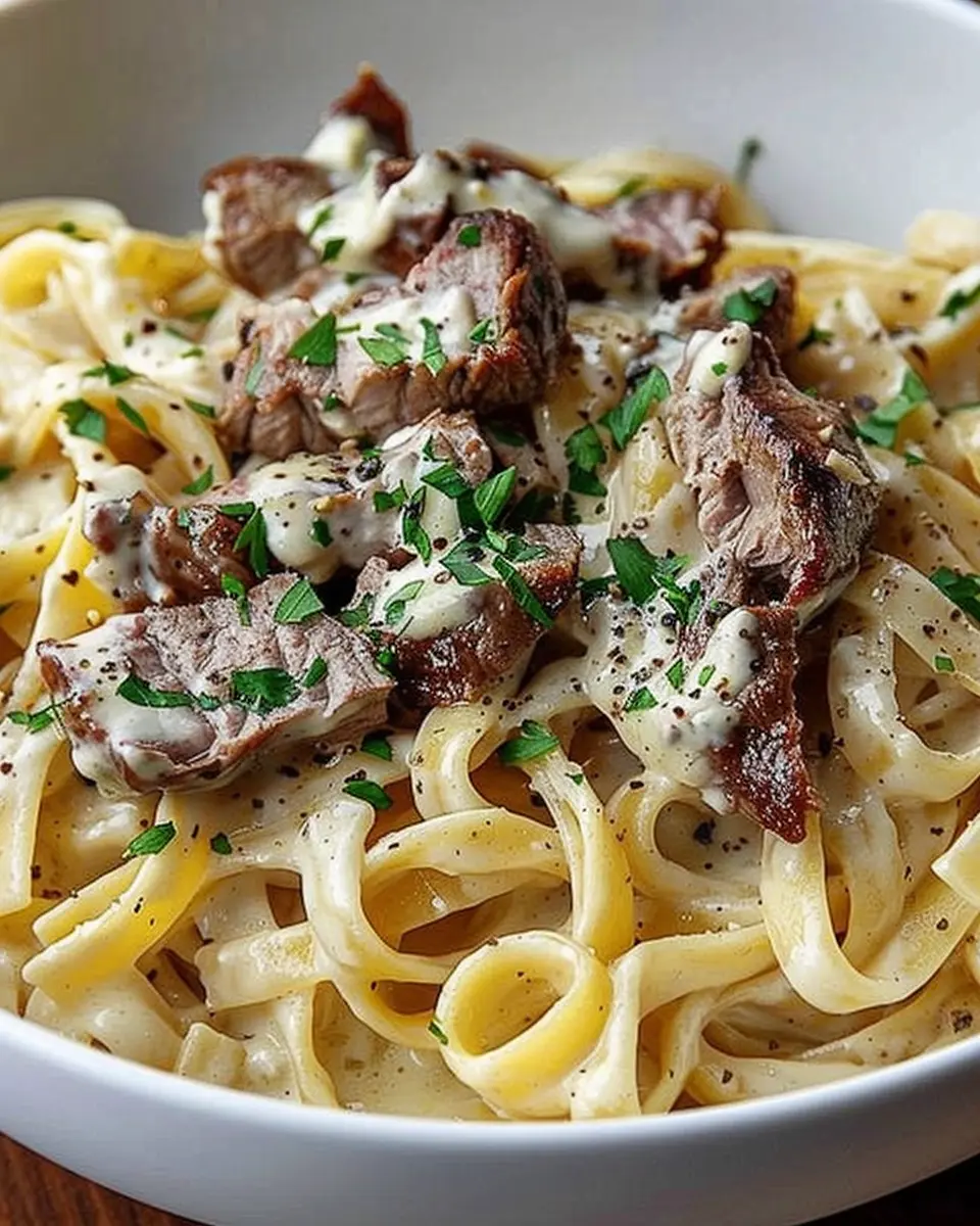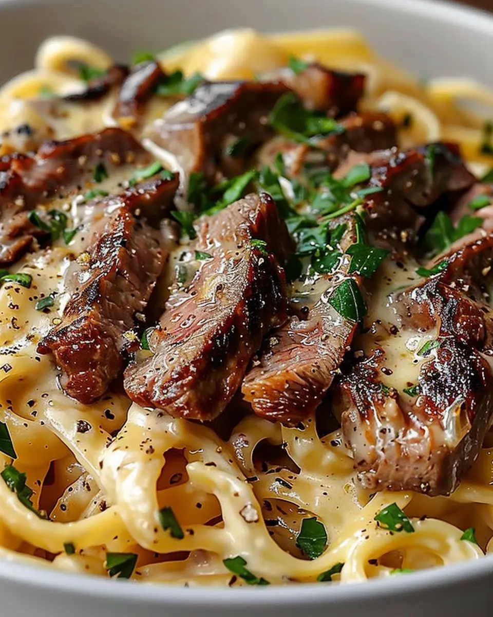 PrintCreamy Steak Pasta Garlic: Indulgent Dinner with Turkey Bacon