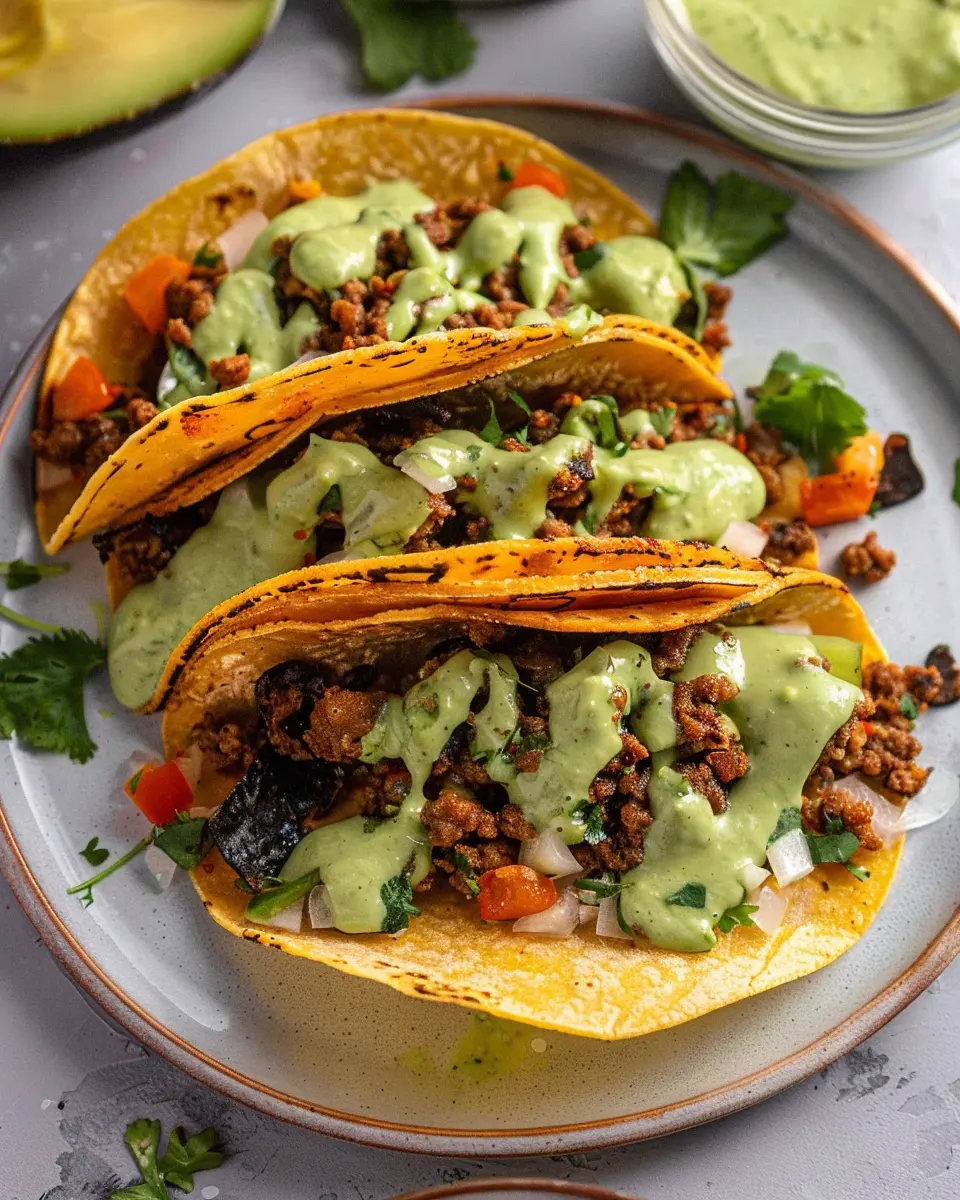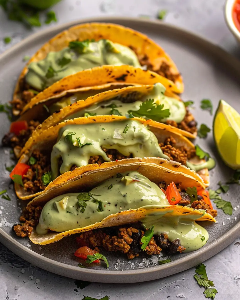 Once they’re done, remove the tacos from the oven and let them cool for a minute. Serve immediately with that creamy avocado sauce drizzled generously over the top or on the side for dipping.