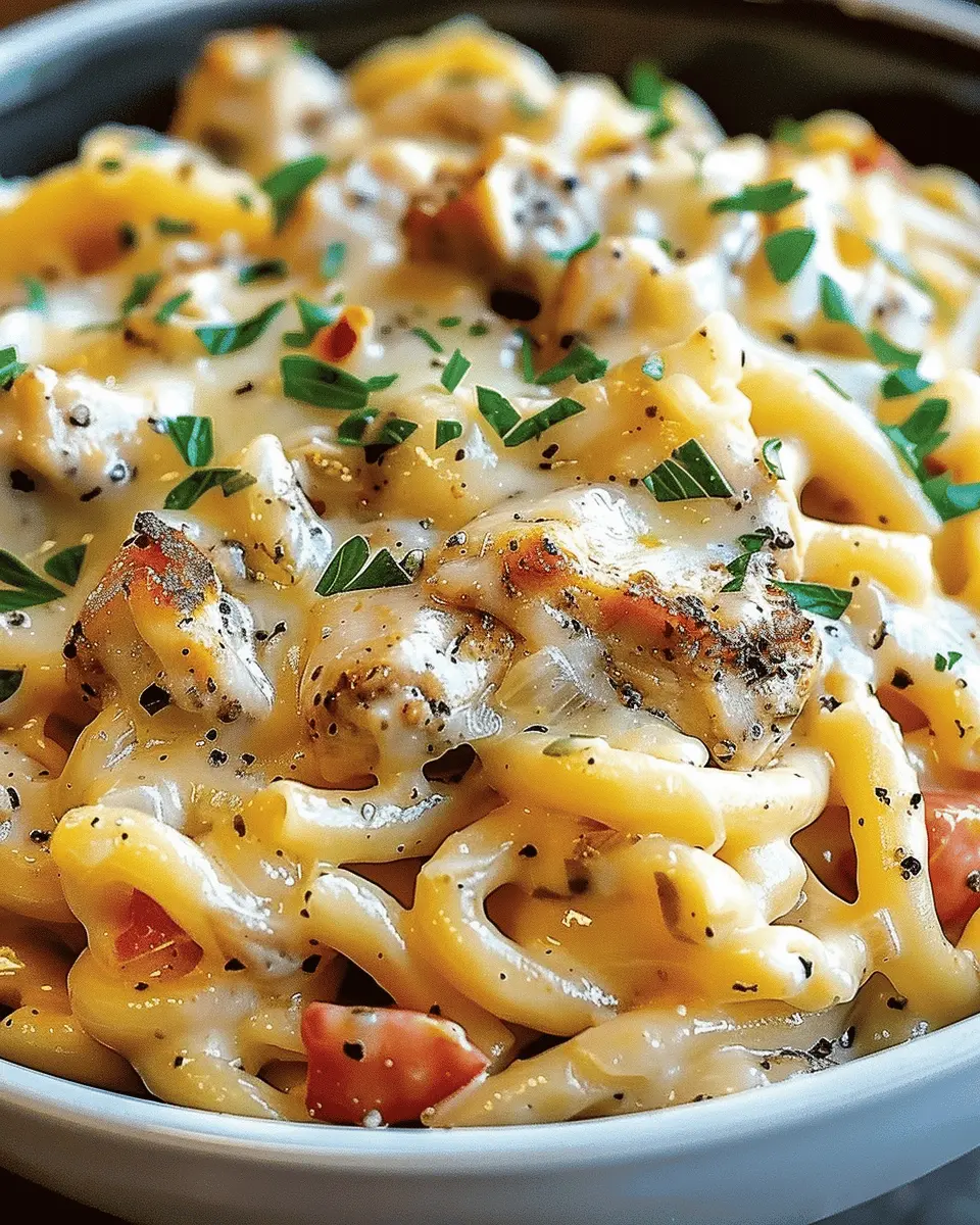 Once your pasta is cooked and drained, add it straight to the crockpot with the chicken and sauce. Toss everything together until the pasta is well-coated. If the mixture feels too thick, stir in a bit of the reserved pasta water until you reach your desired consistency. For an extra pop of freshness, sprinkle some freshly chopped parsley on top before serving.