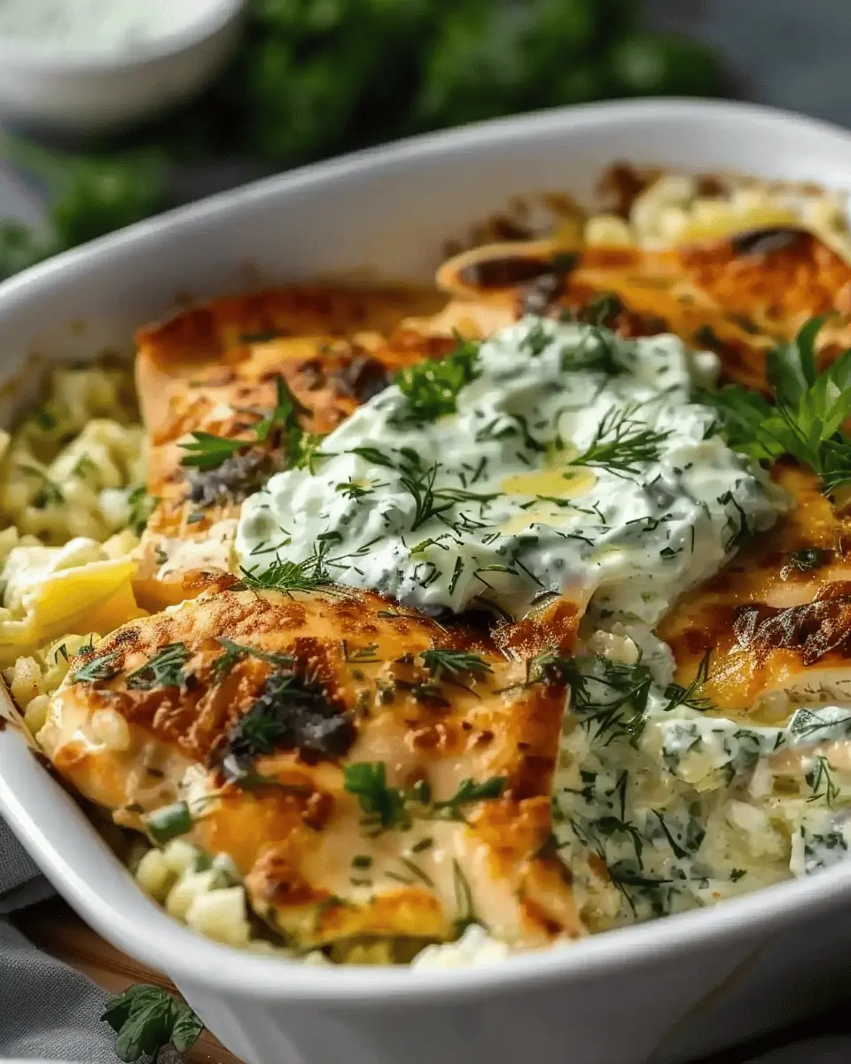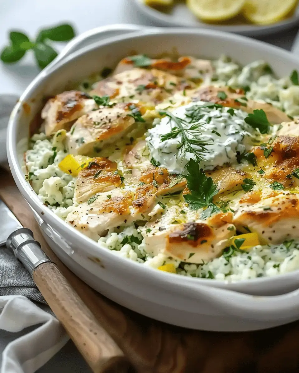 If you’re looking for a simple yet satisfying dish that will impress your friends without keeping you in the kitchen all day, the Dump-and-Bake Chicken Tzatziki Casserole is the answer. This dish combines the rich flavors of tzatziki with tender chicken and fluffy rice—all topped with a sprinkle of herbs that take it to the next level. Let’s dive into each step for creating this delightful casserole!