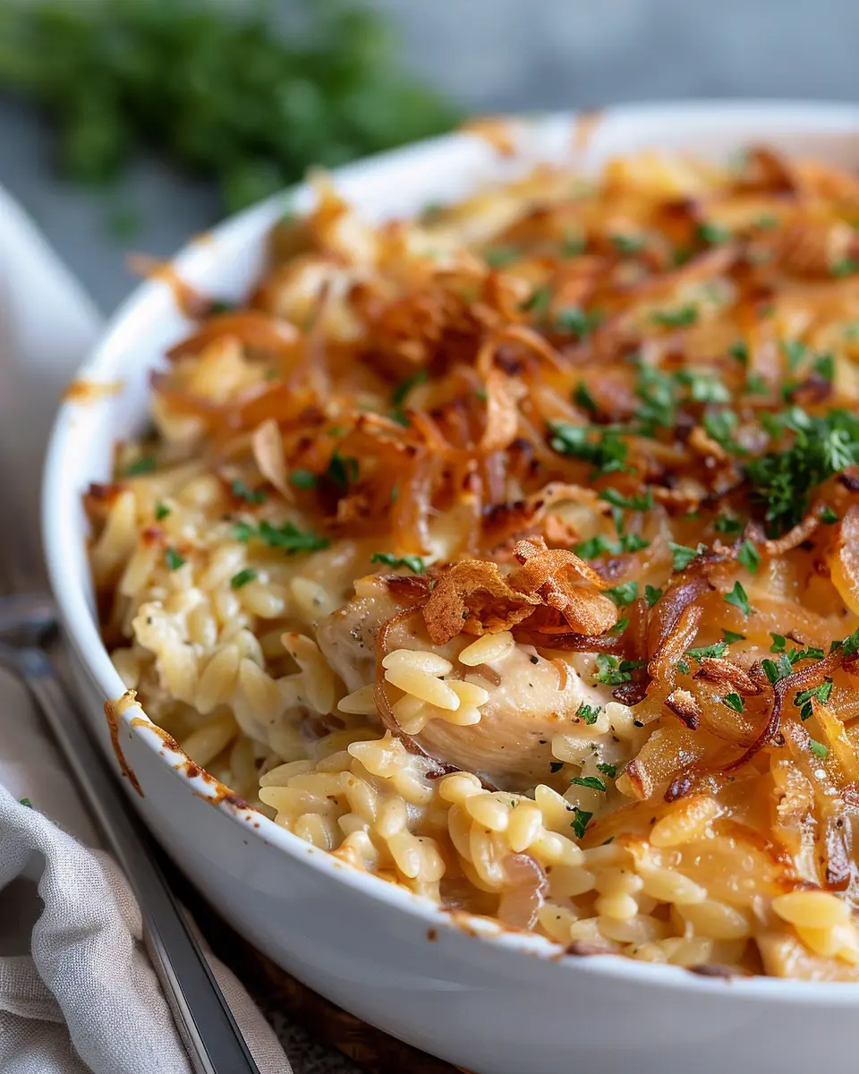 A delicious and hearty casserole combining the flavors of French onion soup with chicken and orzo pasta.