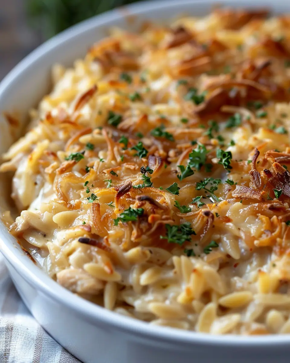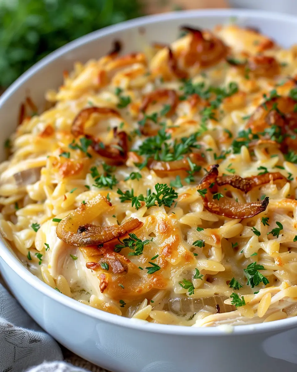 A creamy and comforting French onion chicken orzo casserole that’s perfect for a cozy dinner.