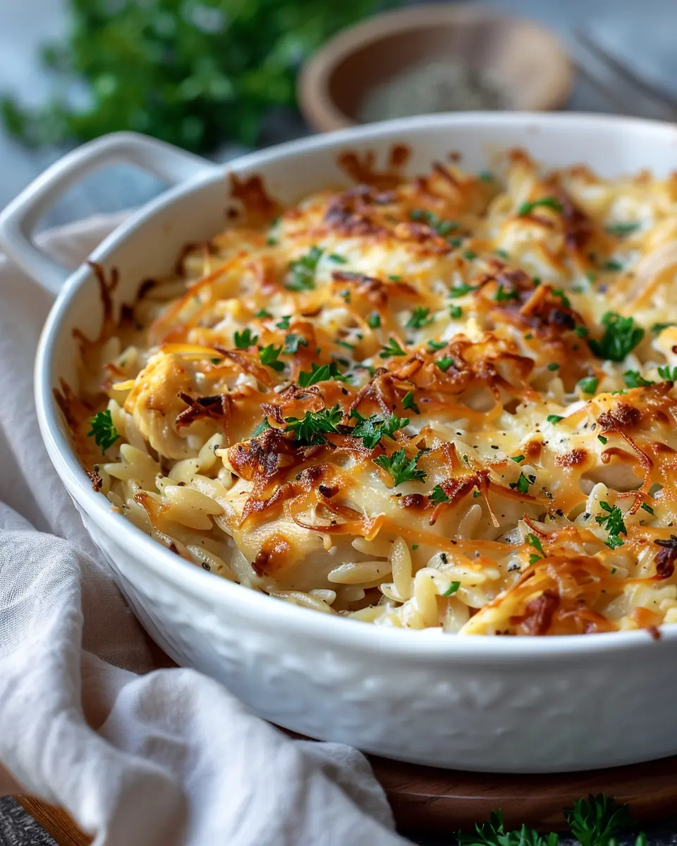 Introduction to French Onion Chicken Orzo Casserole
