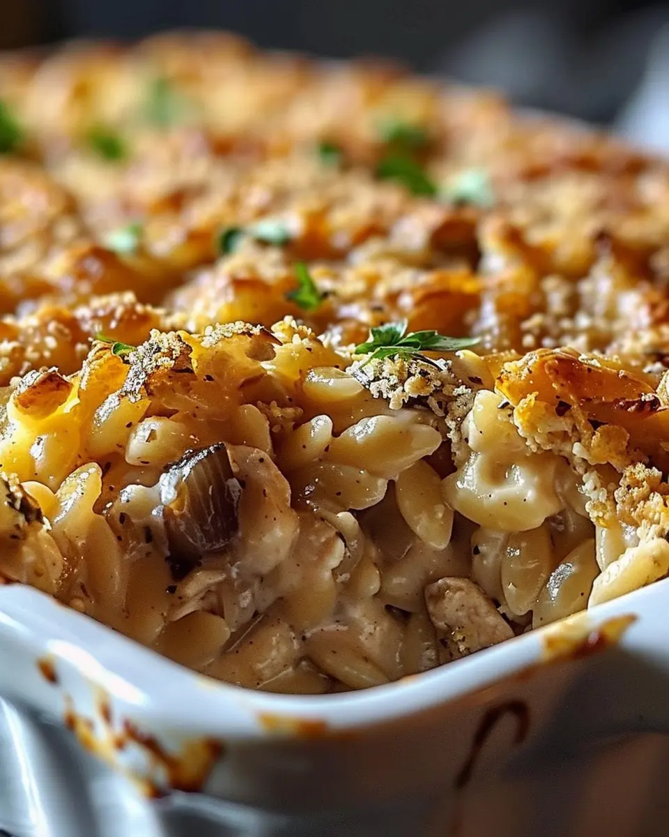 A delicious and comforting casserole made with chicken, orzo, and French onion soup, perfect for family dinners.