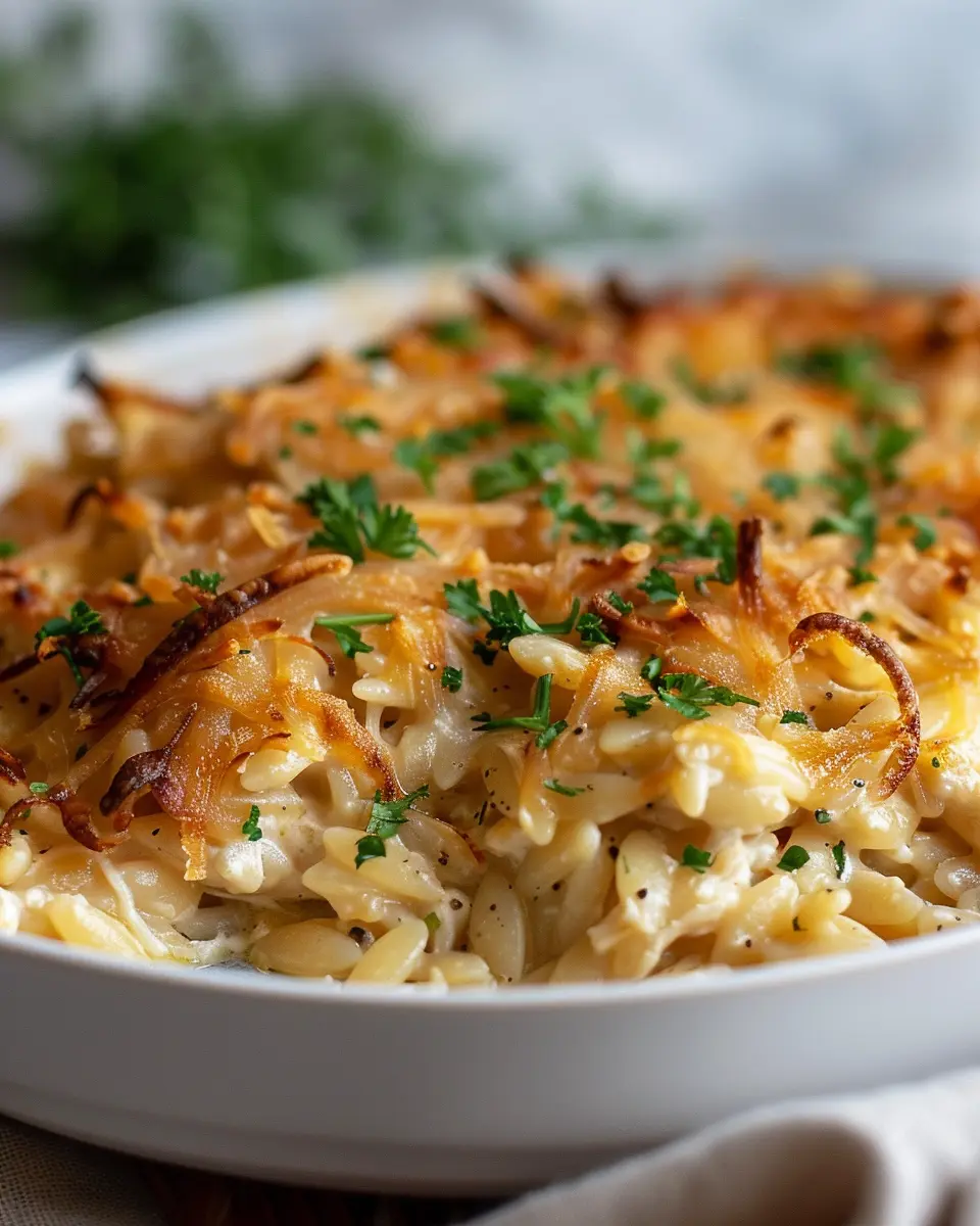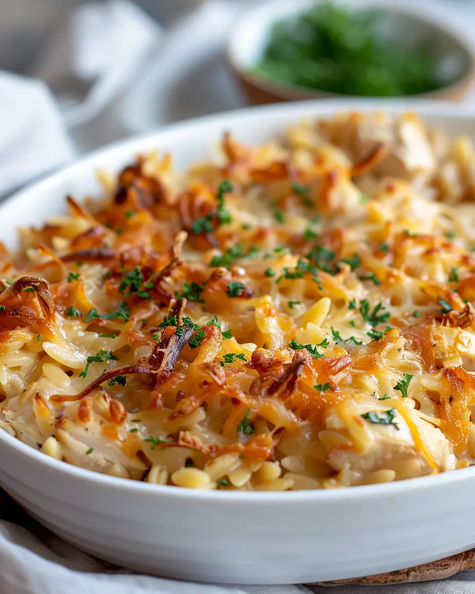 PrintFrench Onion Chicken Orzo Casserole: Easy Comfort Food Delight