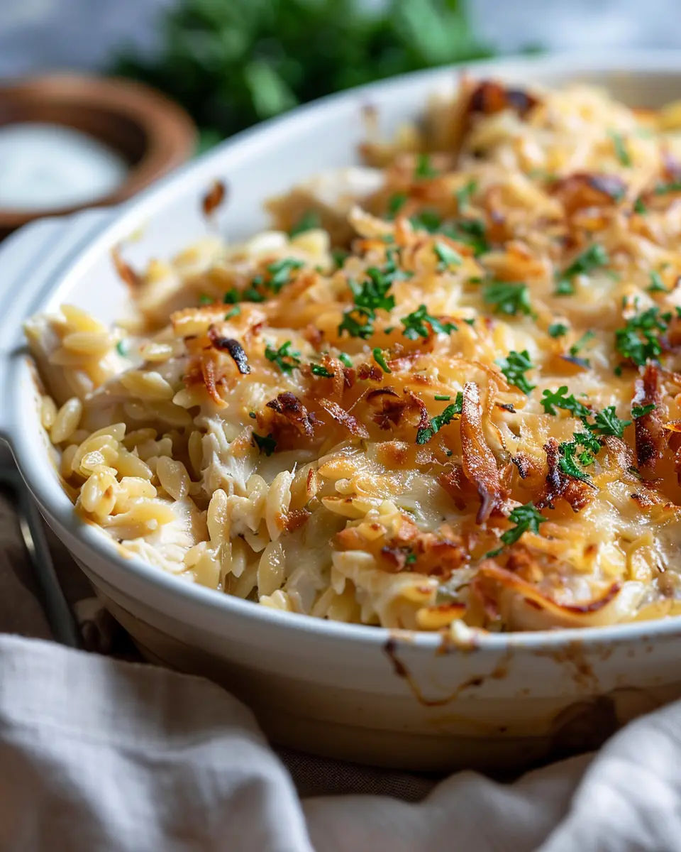 Keywords: French Onion Chicken Orzo Casserole, comfort food, easy recipe, baked casserole