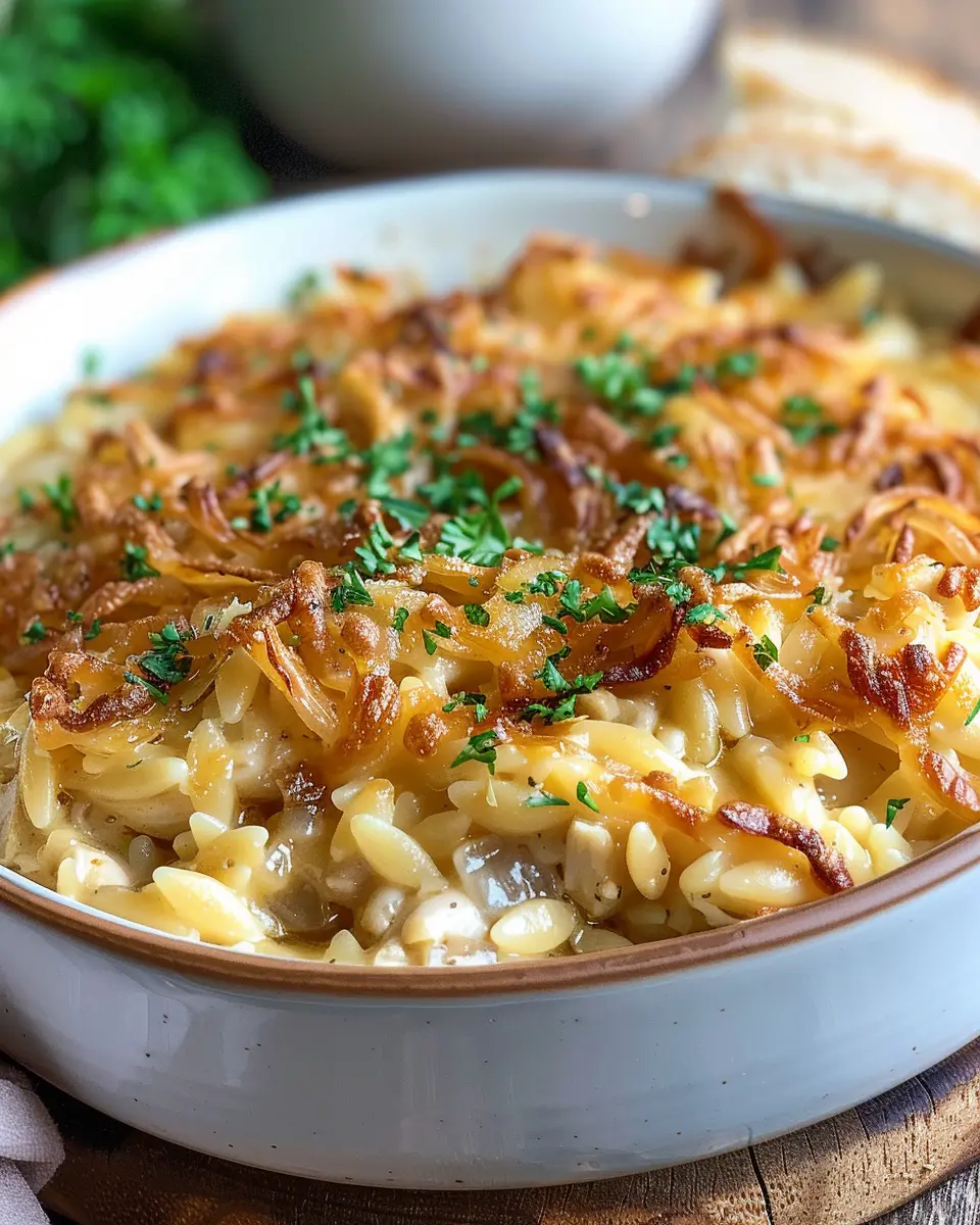 French Onion Chicken Orzo Casserole