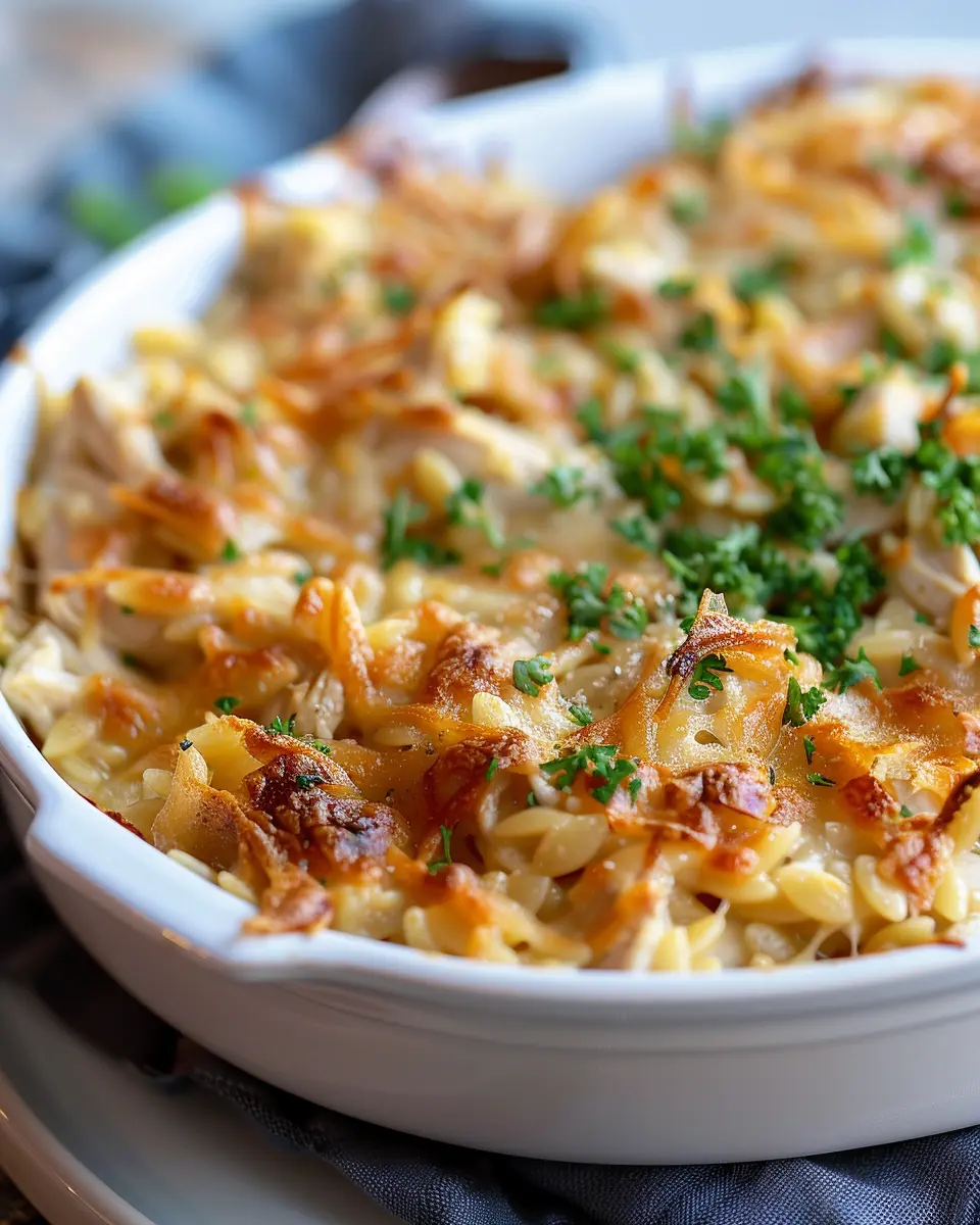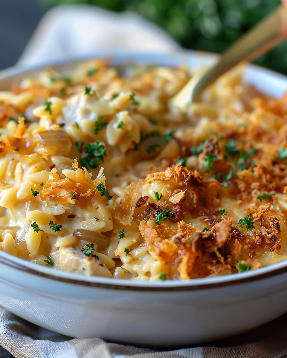 A delicious and hearty casserole combining French onion flavors with chicken and orzo, topped with savory turkey bacon.