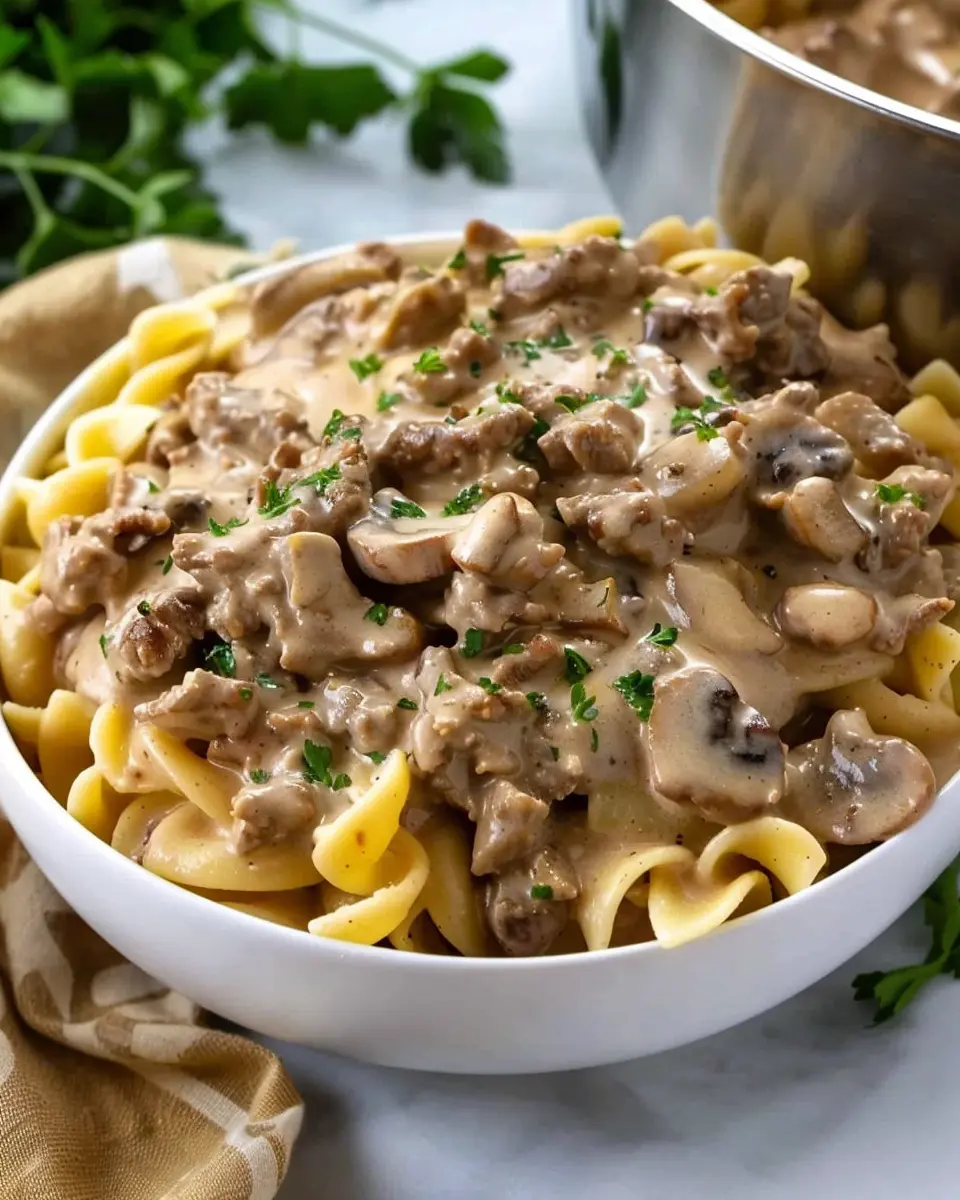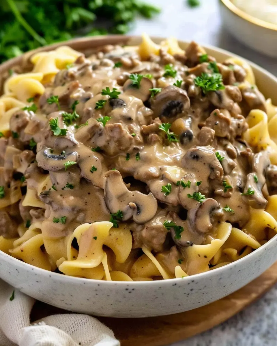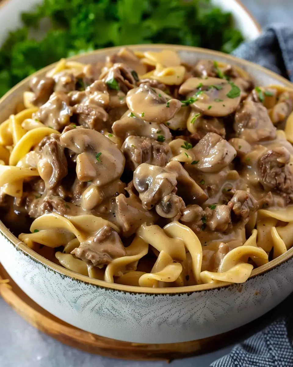 Serve it up: Taste for seasoning and adjust with more salt or pepper if necessary. Serve the stroganoff warm, garnished with parsley if you like.