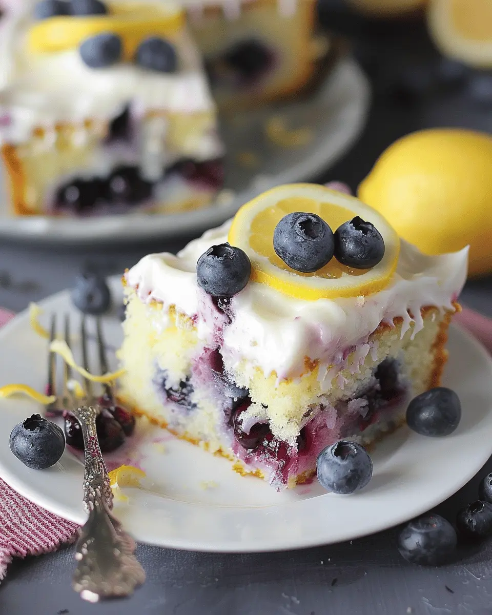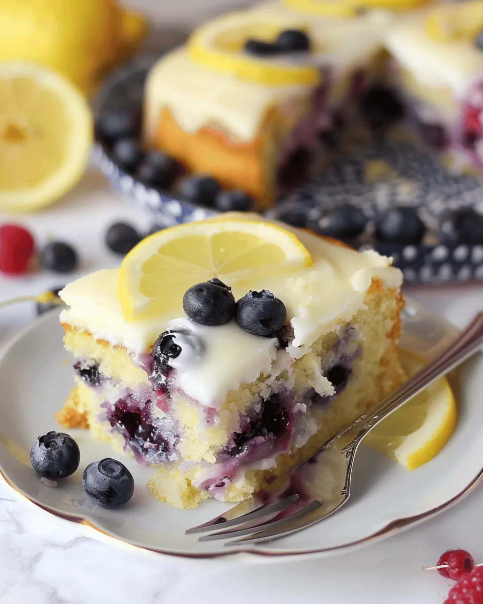With about 18 grams of sugar per slice, this cake offers a balance of sweetness that plays beautifully with the tartness of lemon and the juiciness of blueberries.