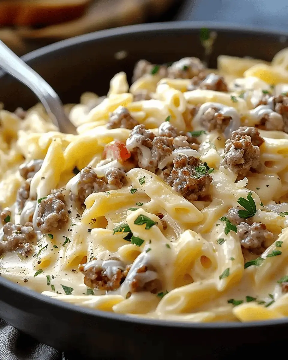Once your masterpiece is complete, it’s time to dig in! Serve your loaded cheeseburger Alfredo pasta hot, garnished with additional toppings if desired. Present it in a large dish for family-style dining or plate it individually for an elegant touch. Pair it with garlic bread or a simple side salad for a wholesome meal. Enjoy every creamy bite, and don’t forget to take pictures—your friends will want this recipe as soon as they see it!