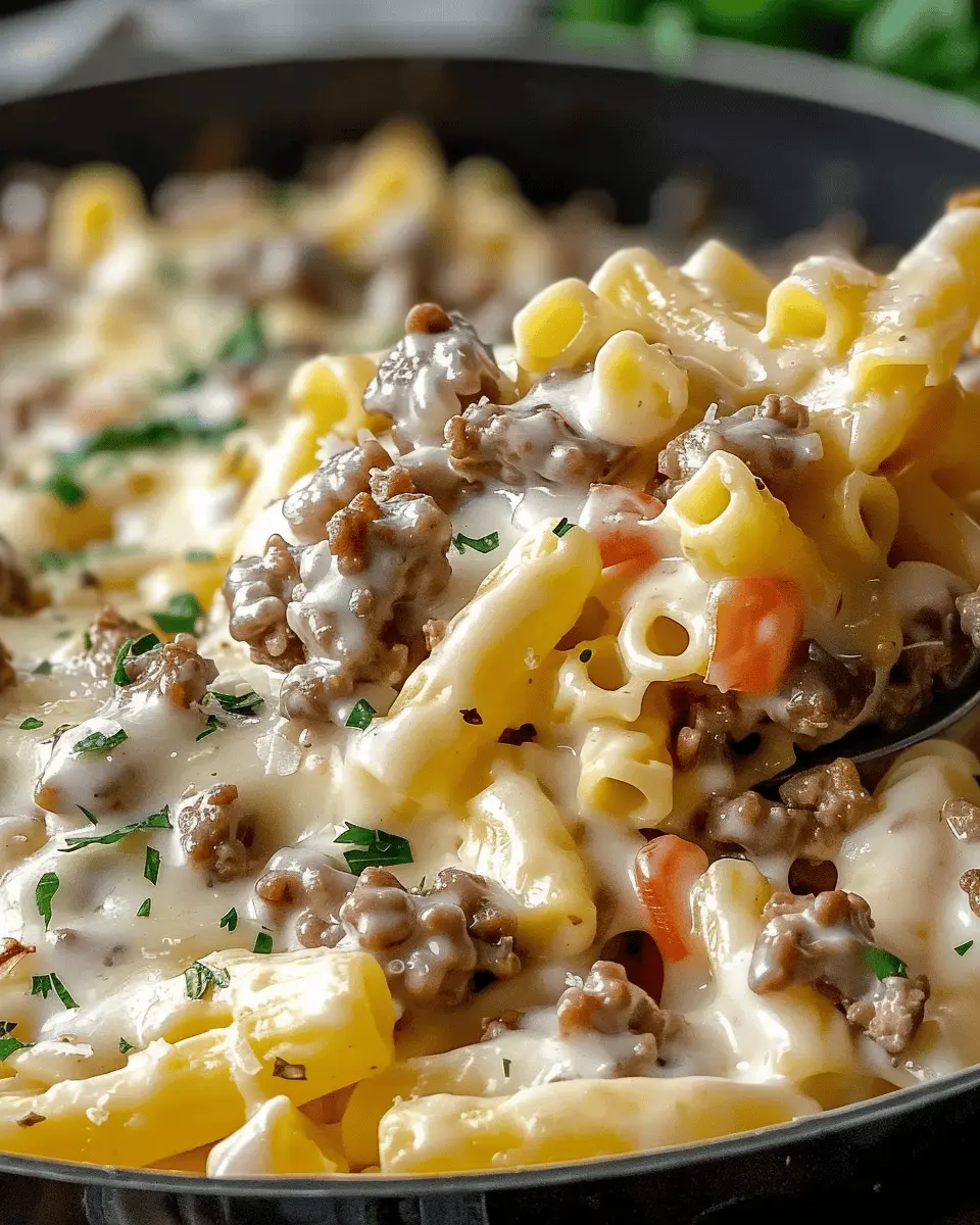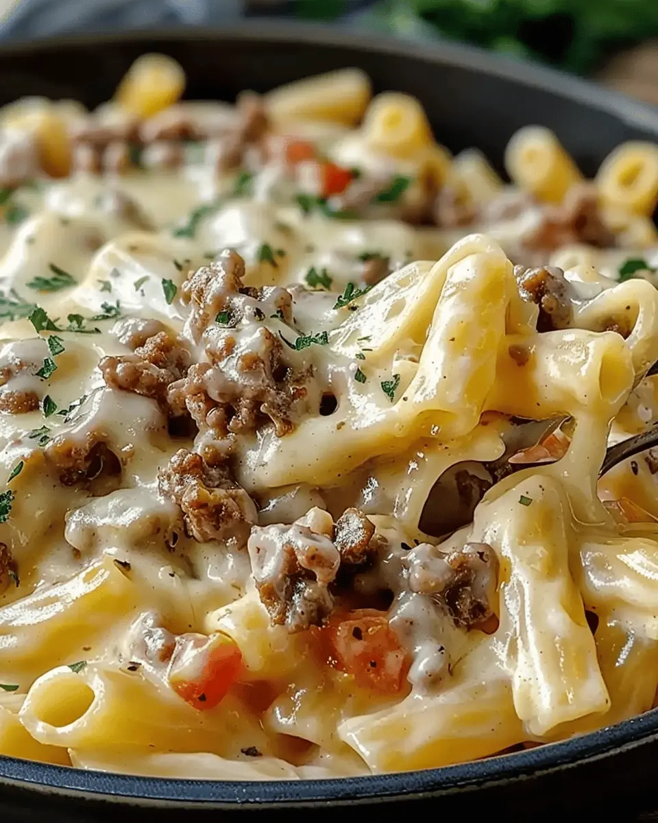 Keywords: Loaded Cheeseburger Alfredo Pasta, Creamy Dinner, Pasta Recipe
