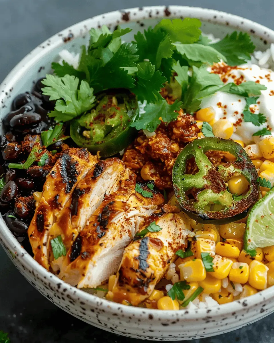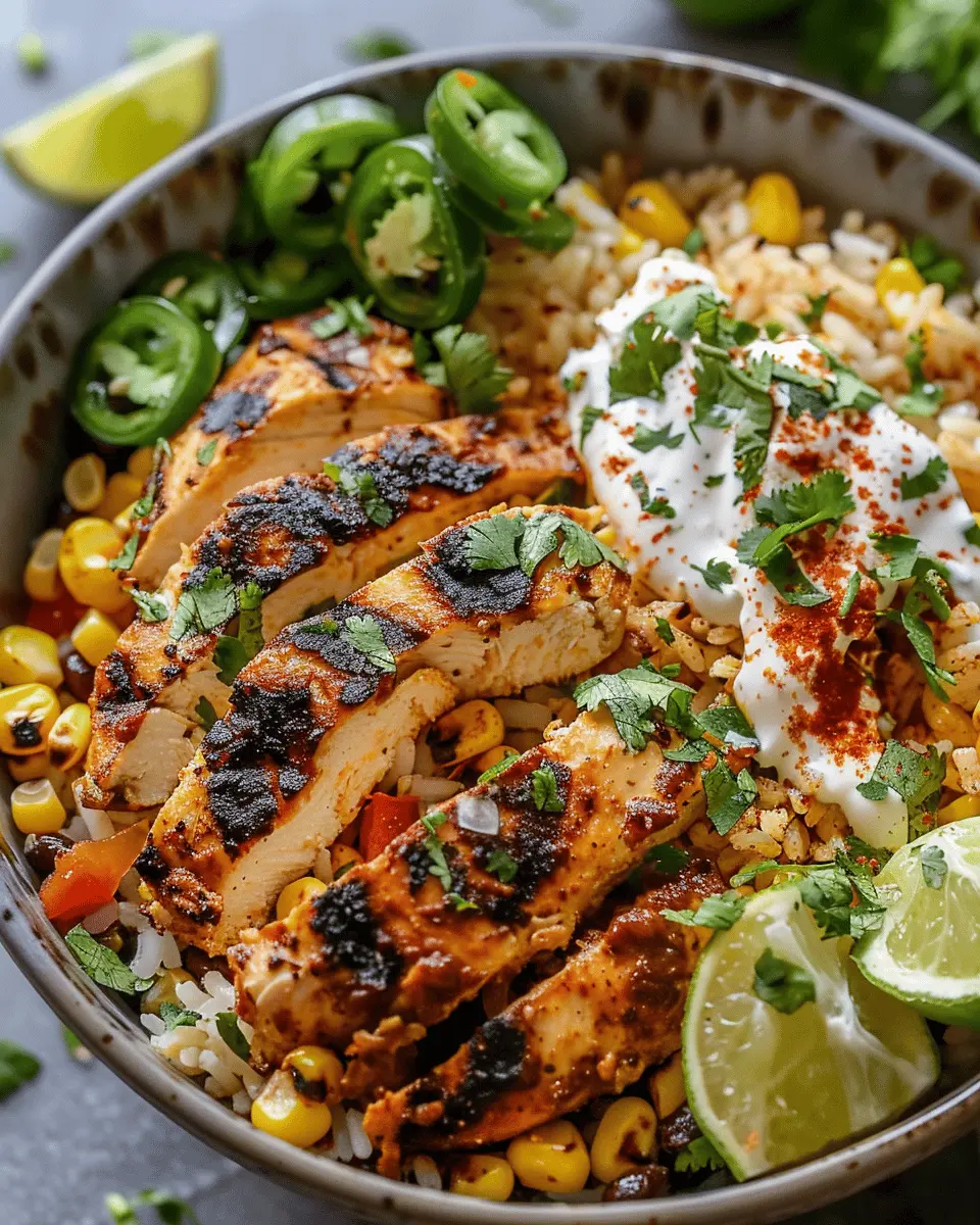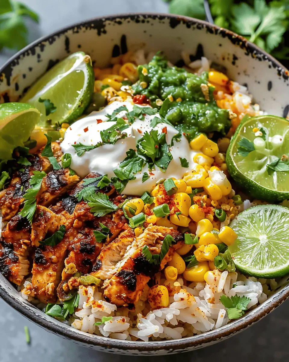 Now comes the fun part—assembly! Start with a generous scoop of fluffy jasmine rice at the bottom of your bowl. Layer on the grilled corn and cooked chicken. Drizzle the lime crema generously over the top, and if you like, sprinkle some crumbled queso fresco, fresh cilantro, and a squeeze of lime juice on top.
